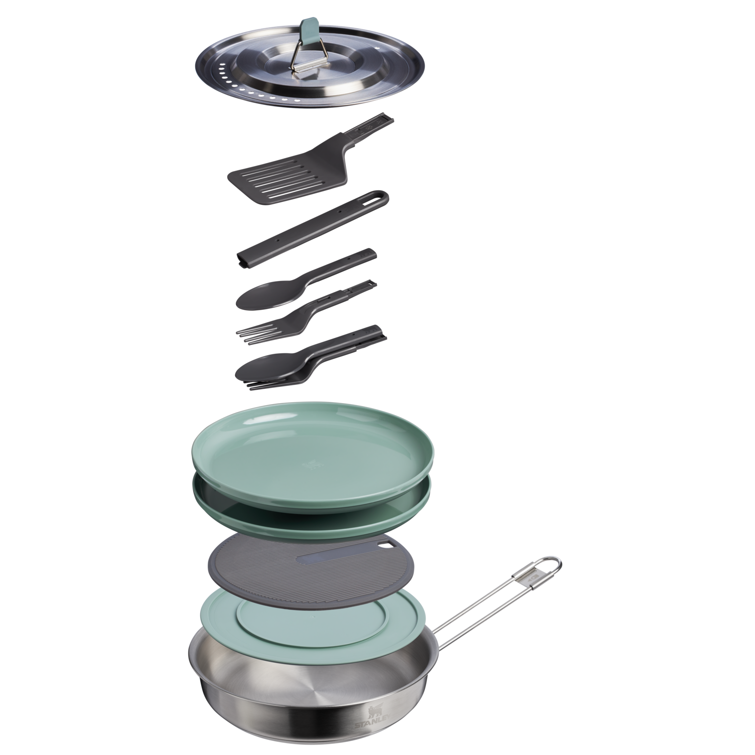Simple and efficient. the 12-piece Wildfare Core Fry Pan Cookset nests together for packing ease. The tri-ply bonded stainless steel pan evenly distributes heat. and the lid has vent and strain holes. The 2-piece spatula and 2-spork set go from compact to full sized. A nonslip cutting board offers space to prep meat and vegetables. while a removable silicone trivet protects surfaces from hot pans. Colorful plates complete the set for outdoor hosting with the comfort of home ?? everything you need in a compact. durable frying pan set.